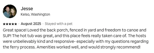 "Laura’s place is great if you’re in search of a unique experience. The ferry ride alone sets this stay apart from other locations. If you want a unique experience, tranquility, water, views…this is the place. Great host and great property - I highly recommend!" - Ben April 2025