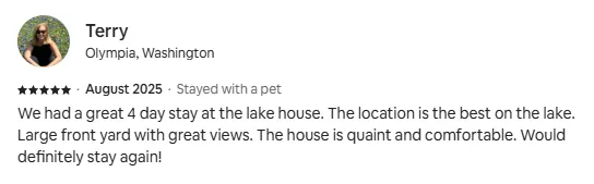 "Serious comfort vibes. Almost instantly we felt right at ease; almost like we were at our own lake house. Laura went to great lengths to give clear directions, & offered resources to find local amenities/events. The lake was so beautiful, and calm. My dogs felt right at home (I loved how pet friendly Laura & the property was), they LOVED running around the huge fenced yard; we were very happy that the yard was poop free as sometimes pet friendly locations are not. There was a nice selection of tea (I love tea). My husband & I are avid fishers, so being able to cast off the dock/from the canoes on the lake, was nice. The hot tub was hot/ready for us when we got there. But the main thing I want to mention, is the back porch. It was seriously perfect! The swings, the view of the lake, having coffee on the porch every morning was the highlight of my stay. We absolutely plan to return this summer with our kiddos. Thank you, Laura." - Tiara March 2025