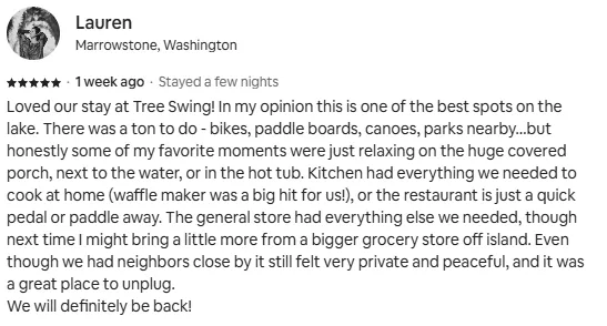 "The tree swing house cannot be unmatched! I searched high and low for a lakefront property that would accommodate five guests comfortably with a hot tub, a fire pit, and a lot of flexible outdoor space, and this place did not disappoint in any area!"
